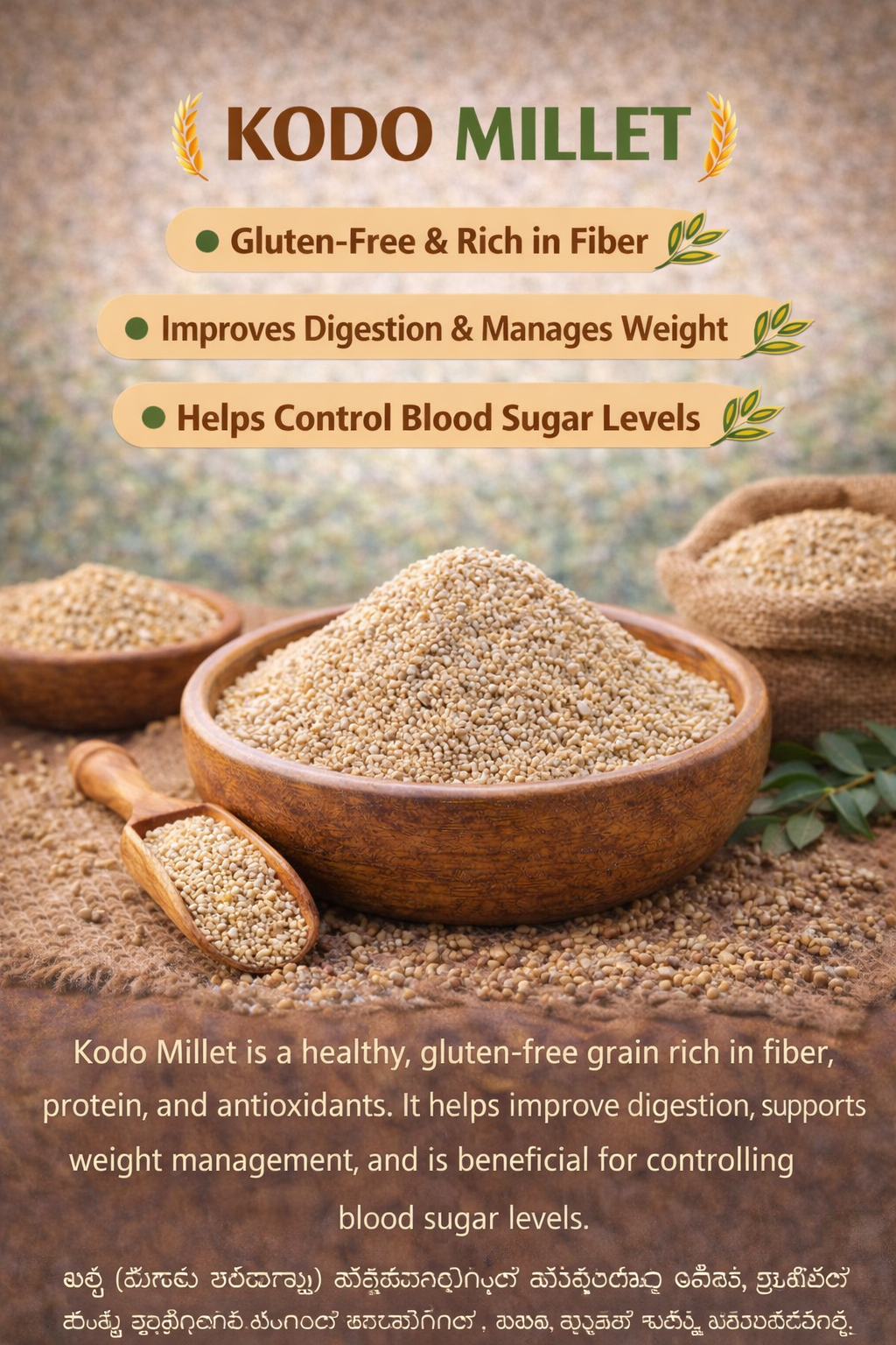 Kodo Millet is a healthy, gluten-free grain rich in fiber, protein, and antioxidants. It helps improve digestion, supports weight management, and is beneficial for controlling blood sugar levels.