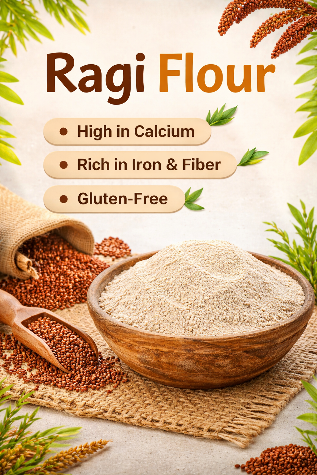 Ragi flour is a healthy, gluten-free grain rich in calcium and iron. It helps strengthen bones, improve digestion, and control blood sugar.